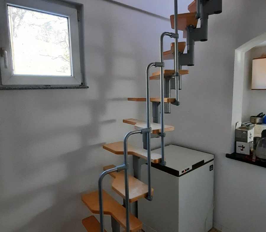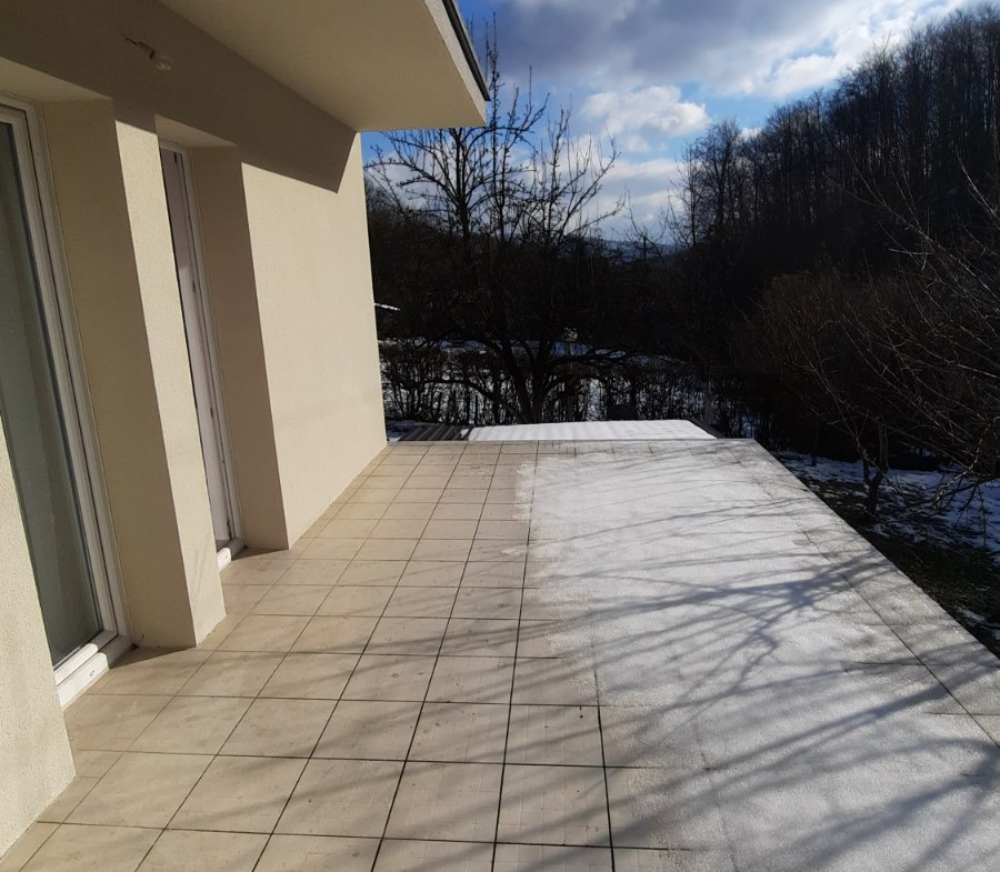 PRVI SPRAT: dvije spavaće sobe,kupatilo, hodnik i jedna veća terasa (2x3m²) koja je otvorena i ima pogled na voćnjak iza kuće gdje se nalaze i dvije ostave .